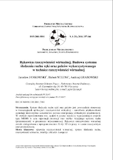 System śledzenia ruchu ręki oraz palców jest powszechnie stosowany w immersyjnych aplikacjach rzeczywistości wirtualnej – umożliwia użytkownikowi symulacji interaktywne uczestnictwo poprzez manipulację wirtualnymi przedmiotami. W artykule zaprezentowano ww. system w postaci rękawicy wyposażonej w czujniki typu MEMS w celu rejestracji orientacji oraz marker wizyjnego systemu ruchu (przemieszczeń) w przestrzeni trójwymiarowej. Rękawica rzeczywistości wirtualnej została zintegrowana z oprogramowaniem Unity 3D do pracy w czasie rzeczywistym oraz przetestowana.