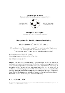 This paper deals with the case of a target satellite in an unknown orientation and location with respect to the master satellite. Feature based monocular pose estimation vision system was presented. The results of analysis, implementation and testing of simulation intended for vision-based navigation applications such as rendezvous of satellites and formation flying are shown. The mobile robot was used as the platform for the vision system. Pose estimation algorithms were implemented in Matlab environment. It was obtained that the proposed method is robust on varying and low light conditions.
