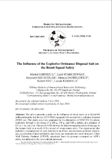 article presents a study on the influence of shock wave on a Hybrid III anthropomorphic test device (ATD HIII) equipped with an explosive ordnance disposal (EOD) suit. The shock wave was generated by the detonation of SEMTEX 1A plastic explosive, formed in the shape of a 250 g, 500 g, and 840 g sphere, at a distance of 0.5 m, 1 m, and 2 m. The use of ATD allowed for determining parameters of damage to the human body as a result of the impact of overpressure wave. The experiments also included a measurement of such parameters as forces and moments on lower extremities, acceleration of head and pelvis, and forces and moments on a neck simulator. Chest Wall Velocity Predictor (CWVP), calculated from the pressure measured on ADT’s chest, was adopted as the most critical parameter. It was revealed that the allowed distance of explosion of a 500 g pure explosive, which does not cause exceeding the allowed parameters, is 1 m.