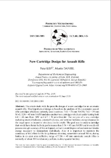 The article deals with the possible design of a new cartridge for an automatic assault rifle. This hypothetical design is based on the analysis of five automatic assault rifle cartridges which are currently used in armies: 7.62 × 51 mm NATO, 7.62 × 39 mm M 43, 5.56 × 45 mm NATO and also another two cartridges which are under testing both 6.8 × 43 mm Rem. SPC and 6.5 × 38 mm Grendel. The analysis of a new cartridge including internal ballistics, external ballistics, and terminal ballistics energy disposed to the target upon an impact is introduced in the article. The goal was to create a cartridge that would have better ballistic performance than 5.56 × 45 mm NATO and it would still possess enough accuracy of fire and speed, so that it could dispose at least minimal kinetic energy necessary to incapacitate individuals. Also it is important to maintain the constancy of this effect for the long distance shooting, somewhere around 500 m, during battles in an open area (effective range of 5.56 × 45 mm automatic assault rifles is normally of about 300 m what only suffices in close quarter battles). To achieve it, the bullet must have the higher sectional density than the 5.56 × 45 mm cartridge. The sectional density reflects the capability of bullet to penetrate through the human tissue within the requirements of wound ballistics. Based on the analysis, the value of sectional density should be approximately of 0.21 g/mm2. The function of fully automatic firing depends on the size of the recoil energy of a weapon which is also related to the muzzle energy that cannot surpass the amount of 2500 J. The new cartridge design is based on the 6 mm Scenar bullet (FMJ – Full Metal Jacket bullet with a weight of 5.8 g) made by the Lapua Company. All the ballistic parameters must be within the intervals of strength and construction possibilities of small arms ammunition. To create a possible variation of the mentioned cartridge where its bullet will be powered by a nitrocellulose propellant (originally made in Czech Republic), a new cartridge case will be created.