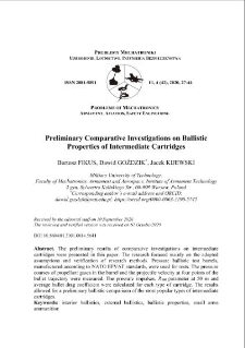 The preliminary results of comparative investigations on intermediate cartridges were presented in this paper. The research focused mainly on the adopted assumptions and verification of research methods. Pressure ballistic test barrels, manufactured according to NATO EPVAT standards, were used for tests. The pressure courses of propellant gases in the barrel and the projectile velocity at four points of the bullet trajectory were measured. The pressure impulses, R100 parameter at 50 m and average bullet drag coefficient were calculated for each type of cartridge. The results allowed for a preliminary ballistic comparison of the most popular types of intermediate cartridges.