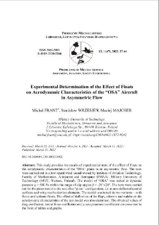This study provides the results of experimental tests of the effect of floats on the aerodynamic characteristics of the “OSA” plane in an asymmetric flow. The tests were carried out in a low-speed wind tunnel owned by Institute of Aviation Technology, Faculty of Mechatronics, Armament and Aerospace (FMAA), Military University of Technology (MUT, Warsaw, Poland). The model of “OSA” was tested at dynamic pressure q = 500 Pa within the range of slip angles β = -2828. The tests were carried out for the plane model in the so-called “plain” configuration, i.e. at non-deflected control surfaces and wing mechanisation elements. The model was tested in two variants – with floats and without floats. The effect of deflection of the flaps, ailerons and rudder on the aerodynamic characteristics of the test model was also examined. The obtained values of drag coefficient, lateral force coefficient and yawing moment coefficient are presented in the form of tables and graphs. The tests showed that the floats had a significant impact on the curves of the characteristics. They result in a considerable increase of the value of the drag coefficient and in a deterioration of weathercock stability.